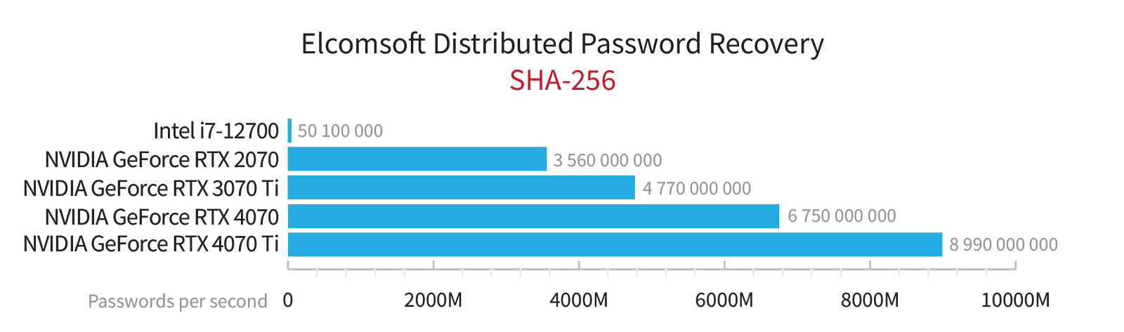 我們的加速技術將一些復雜的計算卸載到快速且可擴展的計算單元(NVIDIA CUDA 內核)上,與中央處理器相比,密碼恢復速度提高了 25 到 250 倍。